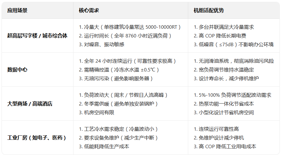 悬浮离心式冷水(热泵)机组适用场景:聚焦大冷量、高要求的商用领域
