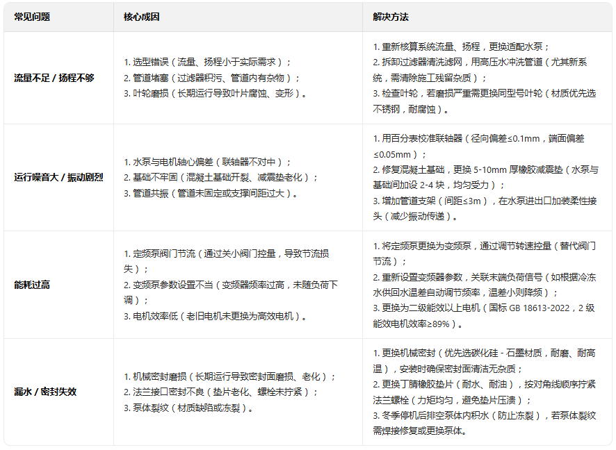 制冷机水泵在运行中易因选型、安装、运维不当出现问题,直接影响制冷系统效率,常见问题及应对方案如下: