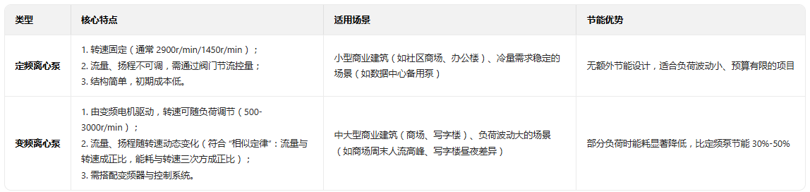 制冷机水泵需根据中央空调系统类型(水系统、水 - 空气系统)、冷量需求、管道阻力选择,主流分为以下两类: