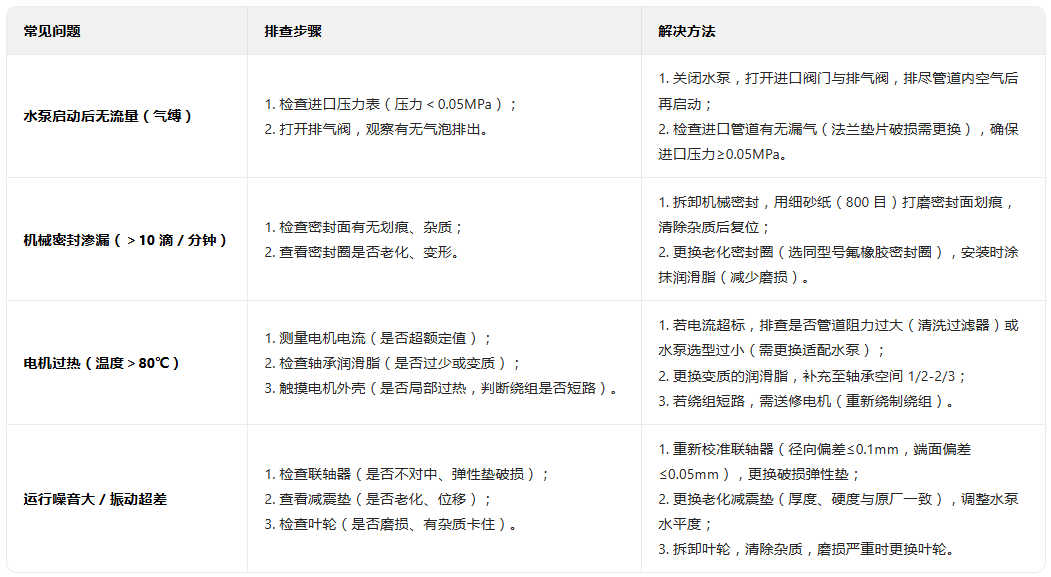 检查机械密封:查看动、静环密封面有无划痕(划痕会导致渗漏),更换老化的密封圈(选丁腈橡胶或氟橡胶材质,耐水、耐老化);