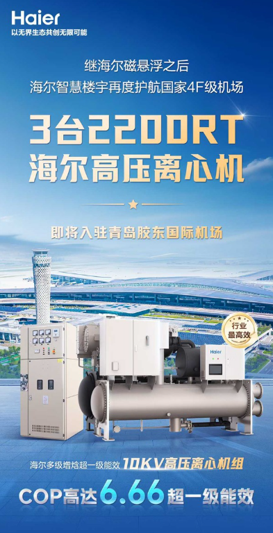 近日,海尔智慧楼宇再度携手青岛胶东国际机场,以领先科技助力机场高质量发展。此次,海尔智慧楼宇将为青岛胶东国际机场提供3台2200RT的多级增焓一级能效10KV高压离心机组,能效COP高达6.66,远超国家一级能效标准,充分展现了海尔在大型公共建筑节能领域的领先实力。