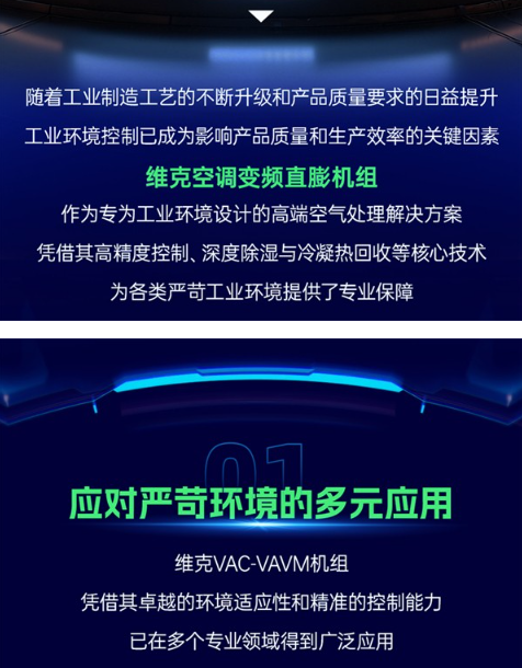 维克空调变频直膨机组作为专为工业环境设计的高端空气处理解决方案,凭借其高精度控制、深度除湿与冷凝热回收等核心技术,为各类严苛工业环境提供了专业保障。